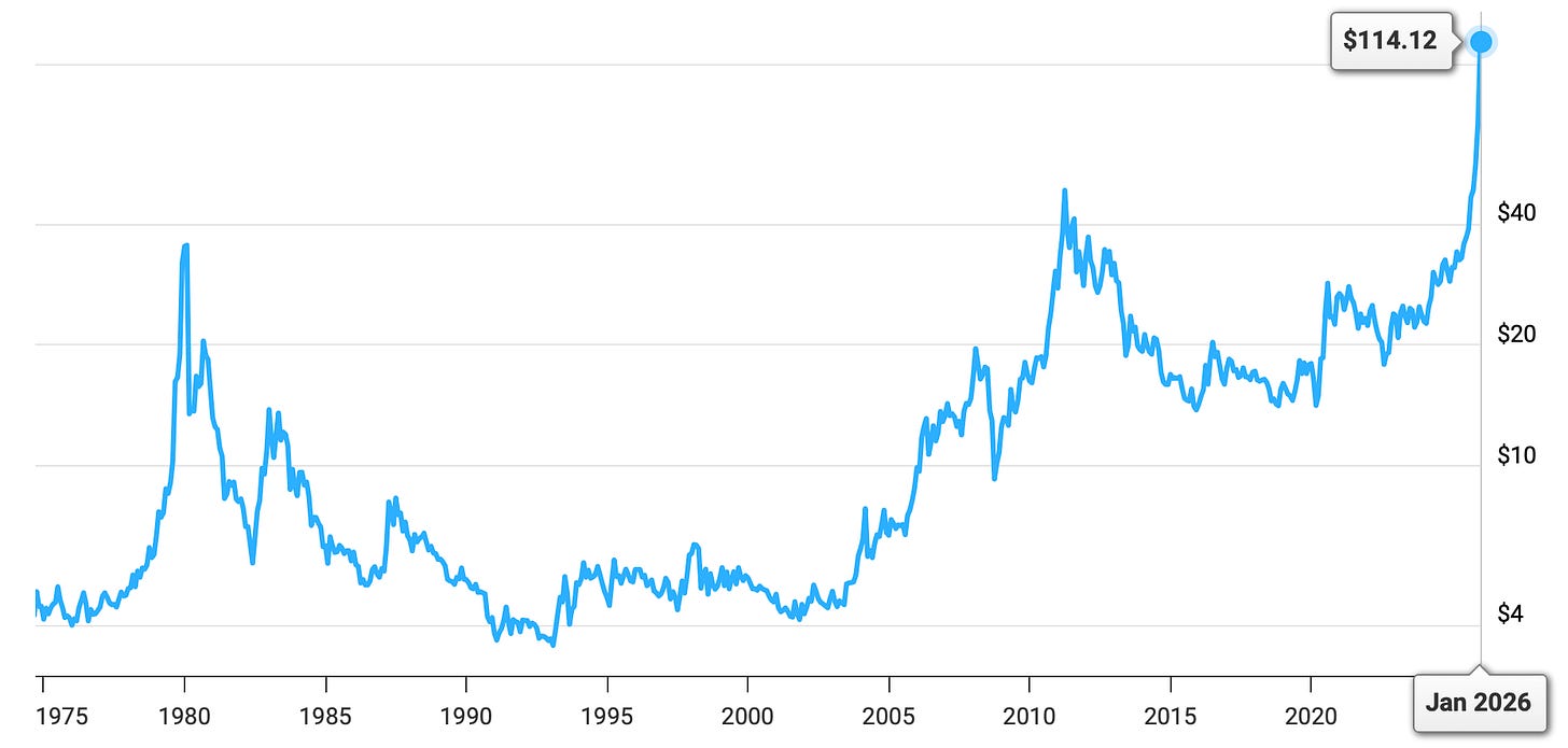See earlier comments about silver from 17 October here, from 19 December here, and from 9 January here. Since I wrote about silver in October, the price has essentially doubled, from $53.32 to the present $106.50. That’s quite something in a little over three months.
